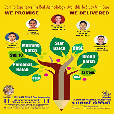 Acharya Academy, which started functioning since 1997 at Vejalpur area, was one of the first institutes to commence such classes and since then hasn't put step wayward.
